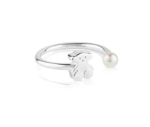 En esta ocasión se trata de un anillo abierto de plata de primera ley, cuyos extremos están coronados respectivamente por un oso y una perla. Una joya elegante y original que nunca pasa de moda.