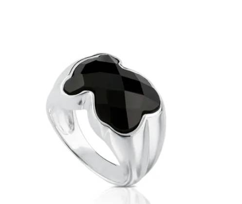Una sortija de plata de primera ley y onix, con motivo de oxo en tamaño de 1,31 x 1 cm. Ideal para lucirla sola o en combinación con anillos de tamaño más reducido.