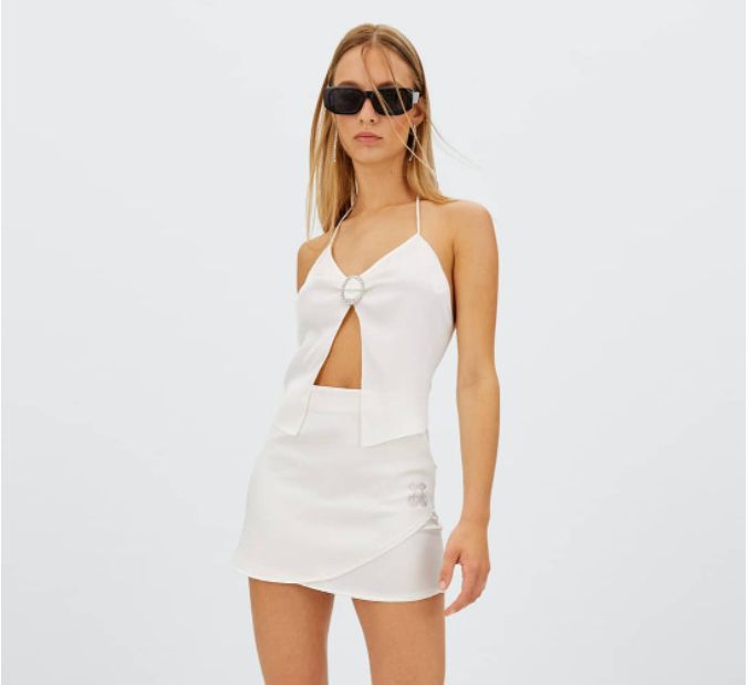 Vamos con otra prenda muy de verano, la falda corta, y con un estilo similar al pantalón anterior, en midi satén Pacha. Es una falda con bajo asimétrico y detalle de logo strass. Un modelo sexy y cómodo para las mejores ocasiones, para lucir tacón abajo y top arriba, por ejemplo. De todas formas casa con cualquier atuendo y en cualquier ocasión, así que es otra compra top de cara a este verano. La tienes en Stradivarius por 22,99 euros.