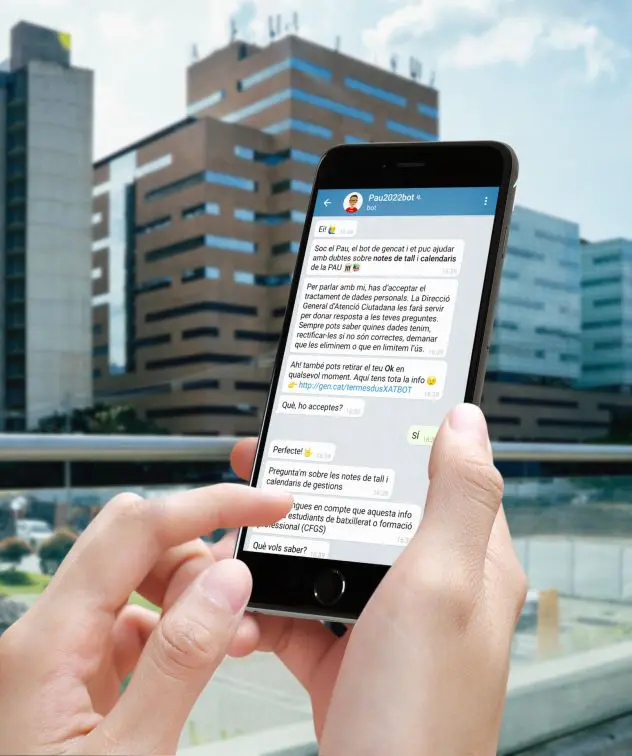 “Ya con anterioridad a la pandemia, el Centro de Telecomunicaciones y Tecnologías de la Información (CTTI) venía considerando establecer un canal de comunicación para los estudiantes preuniversitarios a través de las redes sociales, un sistema automatizado que operara a través de un bot conversacional con personalidad e identidad propias”, explica Laura Manso, directora del Área TIC del Departamento de Investigación y Universidades. El lenguaje utilizado por el chatbot debía ser próximo y familiar para los estudiantes y contar con la capacidad de mantener conversaciones en catalán.