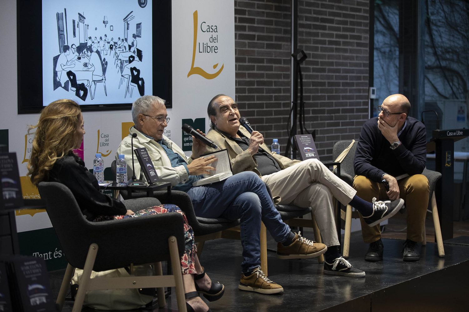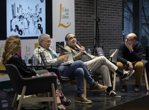 De España estuvo acompañado por los periodistas Xavier Sardà y Jordi Basté en una sala llena a rebosar. A través de la moderación de Eva Moll de Alba, directora de Vegueta Ediciones, los asistentes han disfrutado de una charla amena sobre sus recuerdos en la Barcelona que vivió con gran libertad los últimos años del franquismo y los primeros de la democracia. Todo ello, con una gran dosis de humor, sarcasmo, pero sin nostalgia.
