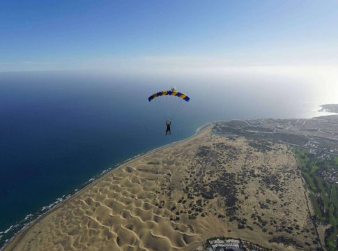 La propuesta de adrenalina que presentan los profesionales de iJump consiste en una emocionante caída libre a más de 200 k/h, seguida por un tranquilo vuelo en paracaídas sobre Playa del Inglés antes de aterrizar suavemente en las famosas Dunas de Maspalomas.