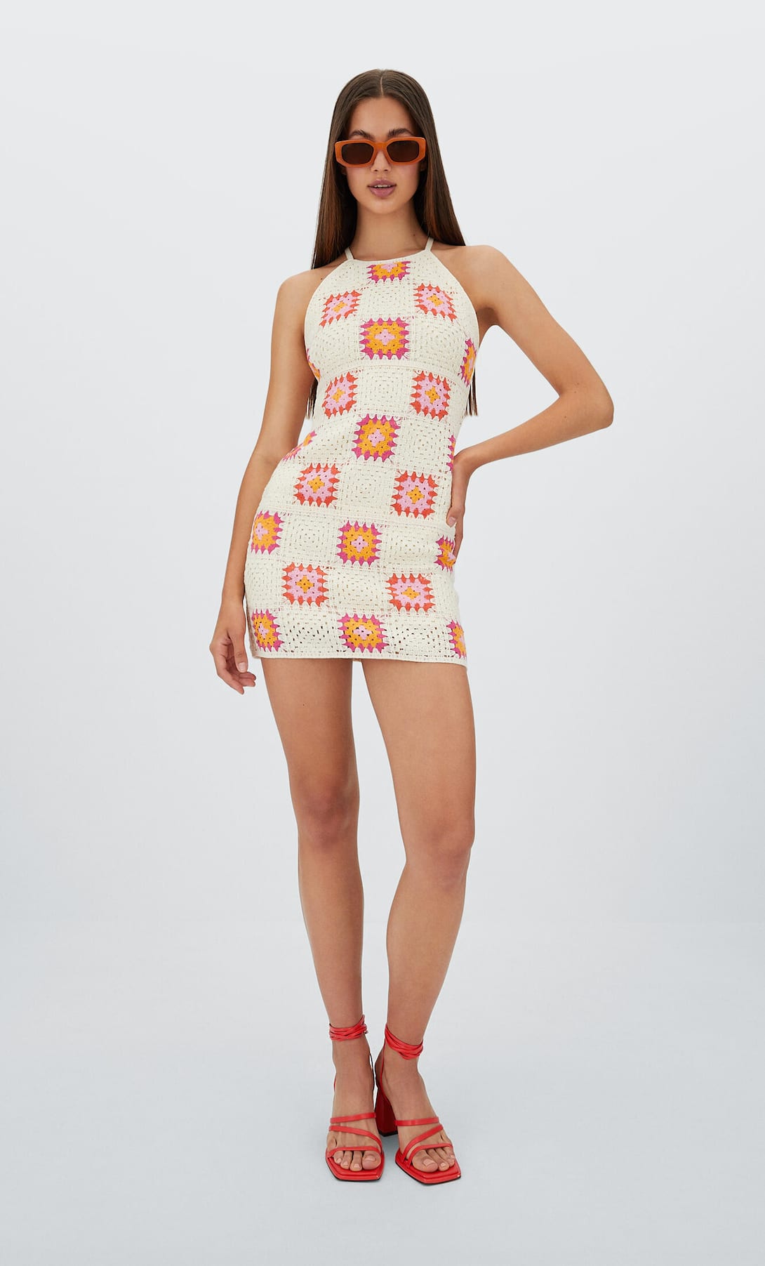 Volvemos al crochet como forma de confección, y en esta ocasión nos encontramos con un original vestido elaborado a base de cuadrados. Unos totalmente lisos y otros con motivos de colores en su interior.