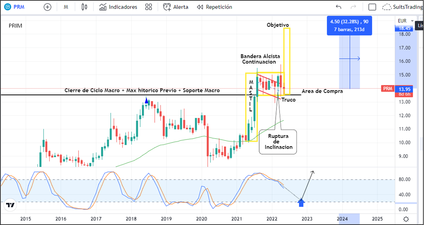 Para el caso de Prim, tenemos establecido que desde las áreas actuales podría generar un movimiento al alza que los lleve a niveles superiores a los 18 euros por acción lo que significa más de un 30% de beneficio estimado a un mediano y largo plazo. Es necesario tener presente que el índice de fuerza relativa se encuentra en el rango de trabajo, con lo cual podría retroceder un tanto más siempre y cuando se mantenga sobre el soporte macro mensual.