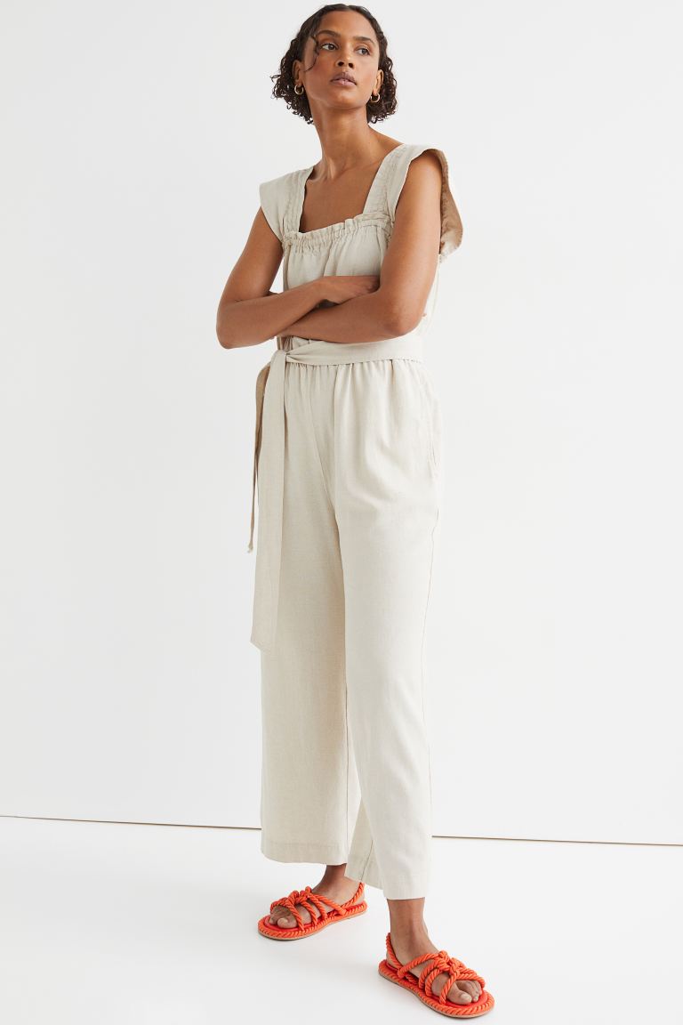 Confeccionado con una mezcla vaporosa de lino y viscosa, se ajusta con cinturón de la misma tela. Con escote cuadrado con elástico y ribete de volante, rematado con tirantes anchos y volante decorativo.