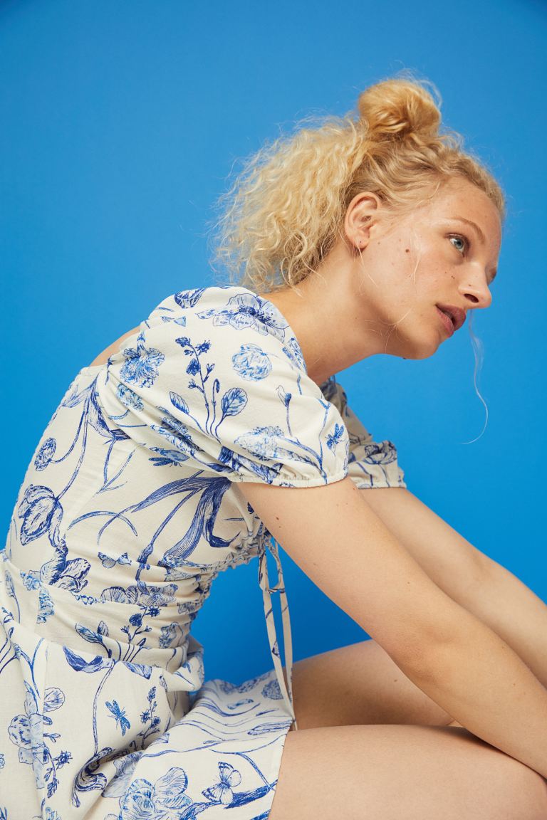 De inspiración romántica, con escote corazón con cordón de ajuste y lazada. Mangas abullonadas y una sección fruncida en la espalda. Y encima la falda tiene un ligero vuelo. Es sencillamente perfecto para el verano.