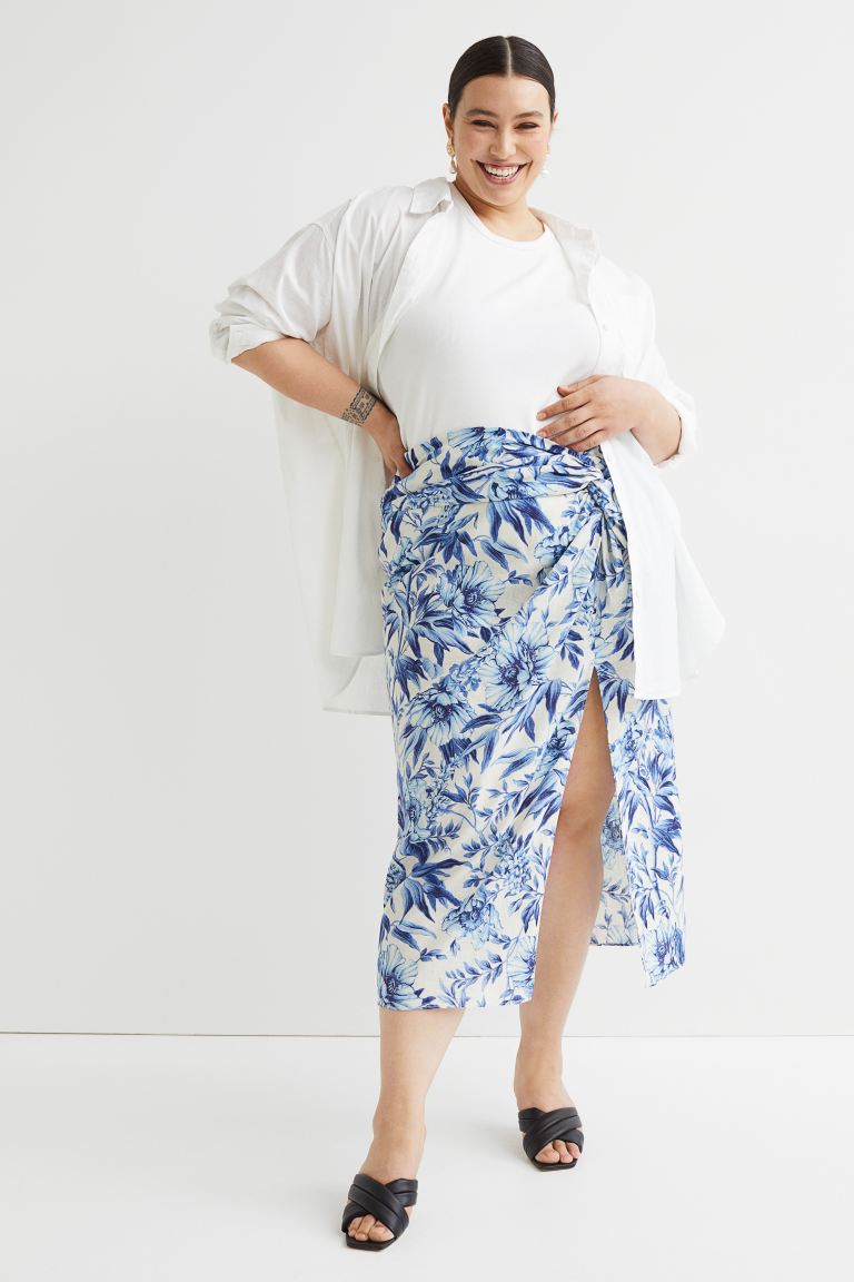 Falda de corte midi confeccionada con mezcla de lino y algodón. De cintura estándar con efecto drapeado y detalle girado en la parte delantera. La pronunciada abertura te brinda una total libertad de movimientos.