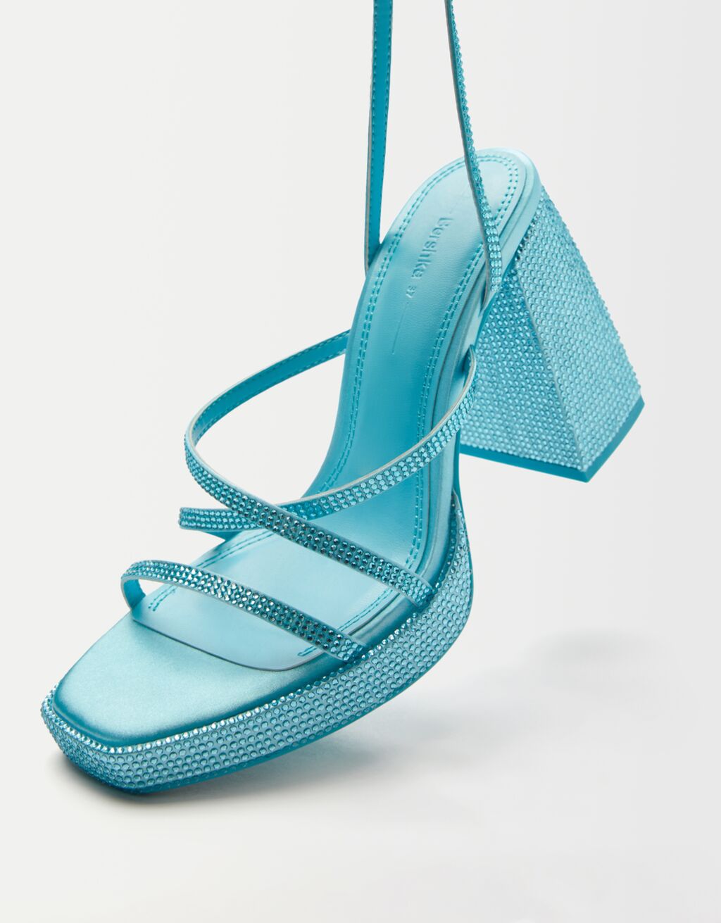 Llena de glamour cada uno de tus pasos con estas increíbles sandalias de tacón en color azul con cristales. De punta cuadrada y con cierre mediante pulsera con hebilla. Con un tacón de 10 cm y plataforma de 2 cm.