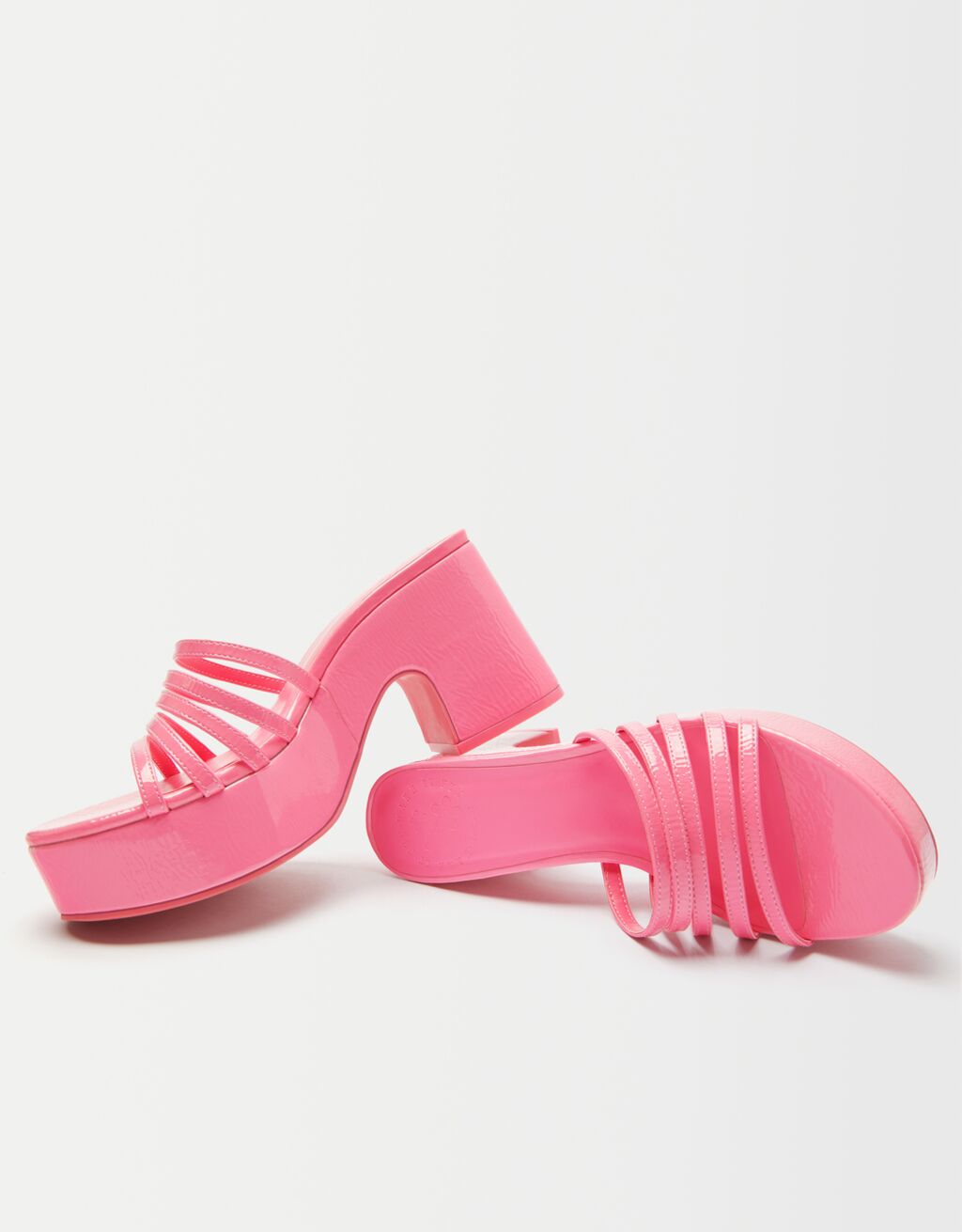 Otra de las novedades más refrescantes para este verano es este par de sandalias de tacón de 9 cm con plataforma de 3,5 cm y plantilla técnica flexible a base de látex. Un calzado tipo mule con acabado brillo.