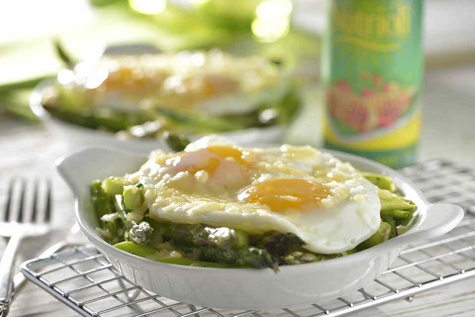 Los huevos fritos son un plato que se puede degustar todo el año. Si no quieres acompañarlos de las típicas patatas, prueba esta receta. Empieza creando una cama en el plato con los espárragos de bote bien escurridos.