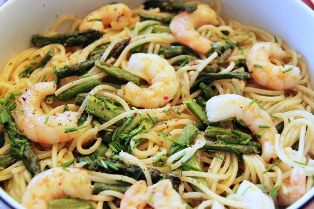 Cruce unos tallarines o unos espaguetis. En una sartén pocha una cebolla con un par de dientes de ajo y luego añade unas gamas. En última instancia pica los espárragos de bote y dóralos con el resto de ingredientes.