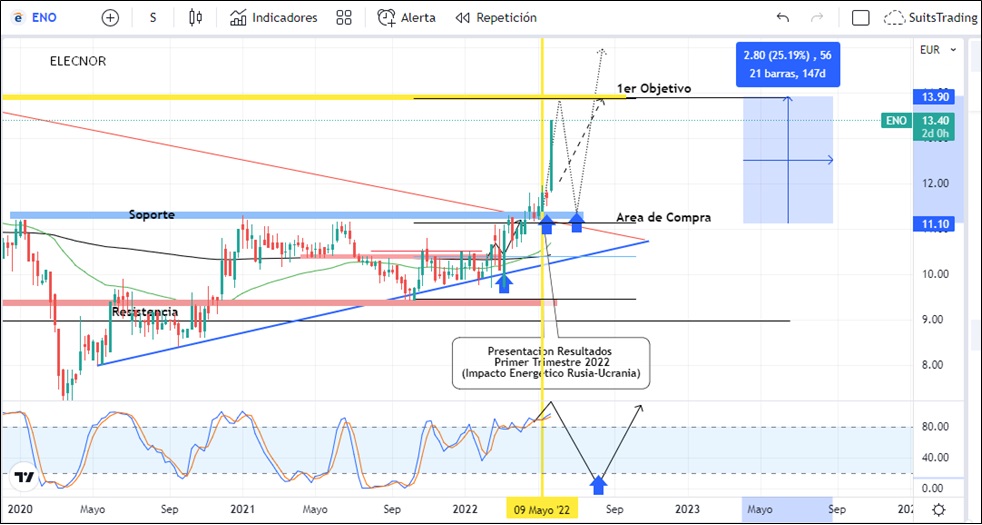 El sector de la energía renovable asume que dentro de poco más de 20 años, será el protagonista de la oferta de energía en más del 50% a nivel mundial, razón por la que el sector y su conjunto deben ser de interés para los inversionistas de mediano y largo plazo. Sin embargo, como lo comentábamos el pasado 5 de mayo a través de nuestra web sobre posibles y latentes oportunidades en Elecnor, la acción ha desarrollado el movimiento esperado al alza y esperamos cumplir el primer objetivo en los 13,95 euros previstos con anterioridad.