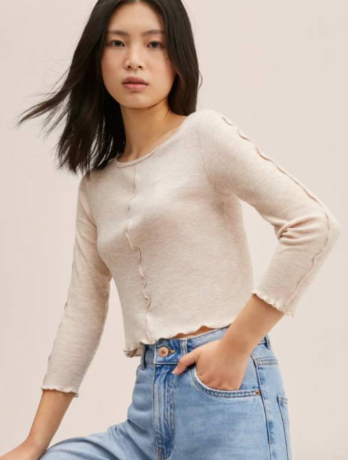 Con detalle de costuras decorativas y terminaciones festoneadas. Con manga tres cuartos y diseño crop slim fit y cuello redondo. Perfecta para combinarla con tus vaqueros y tus deportivas favoritas.