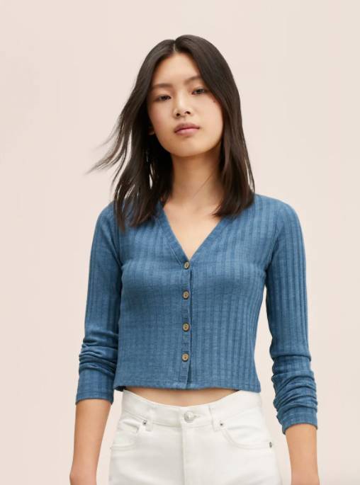 Con los buenos precios que tiene Mango ahora mismo, puedes aprovechar para comprar prendas de cara a cuando refresque el tiempo. Por ejemplo, esta camiseta de manga larga y punto canalé.
