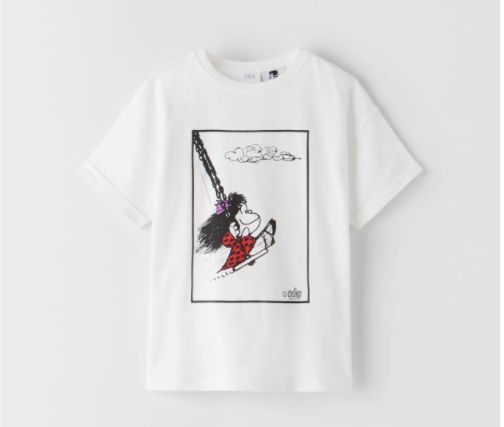 Por motivos evidentes, nos encanta esta camiseta de Zara en la que le hacen un guiño al recientemente fallecido Quino. A pesar de que el dibujante realizó otros diseños, fue su personaje de comic Mafalda el que le catapultó a la fama mundial. Esa niña irónica preocupada por la humanidad y por la paz mundial que más de medio siglo después de su nacimiento sigue estando vigente y que saltó de los comics para inundar todo tipo de formatos de merchandising como esta camiseta.