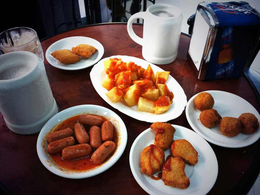 Desde luego enemigos del gasto y de gastar dinero en comida. Todo un clásico en el barrio de La Elipa, con cada consumición te ponen aproximadamente 5 tapas. Varían en función del día, dentro de las opciones está la ensalada de pasta, aros de cebolla, empanadillas, pollo, nuggets, croquetas de bacalao, patatas bravas, mini tortillas. La calidad de la comida es buena y casera.