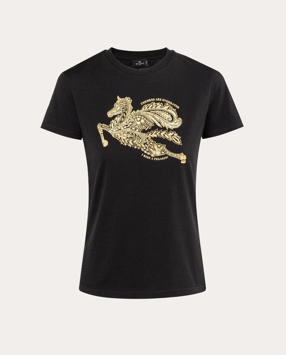 Ahora tenemos esta camiseta de algodón con pegado de Etro de color negro. Es una prenda 100% algodón, la cual destaca por su estampado con el mítico caballo pegado, el cual está hecho en color dorado. Además, está acompañado con dos inscripciones en el mismo color.
