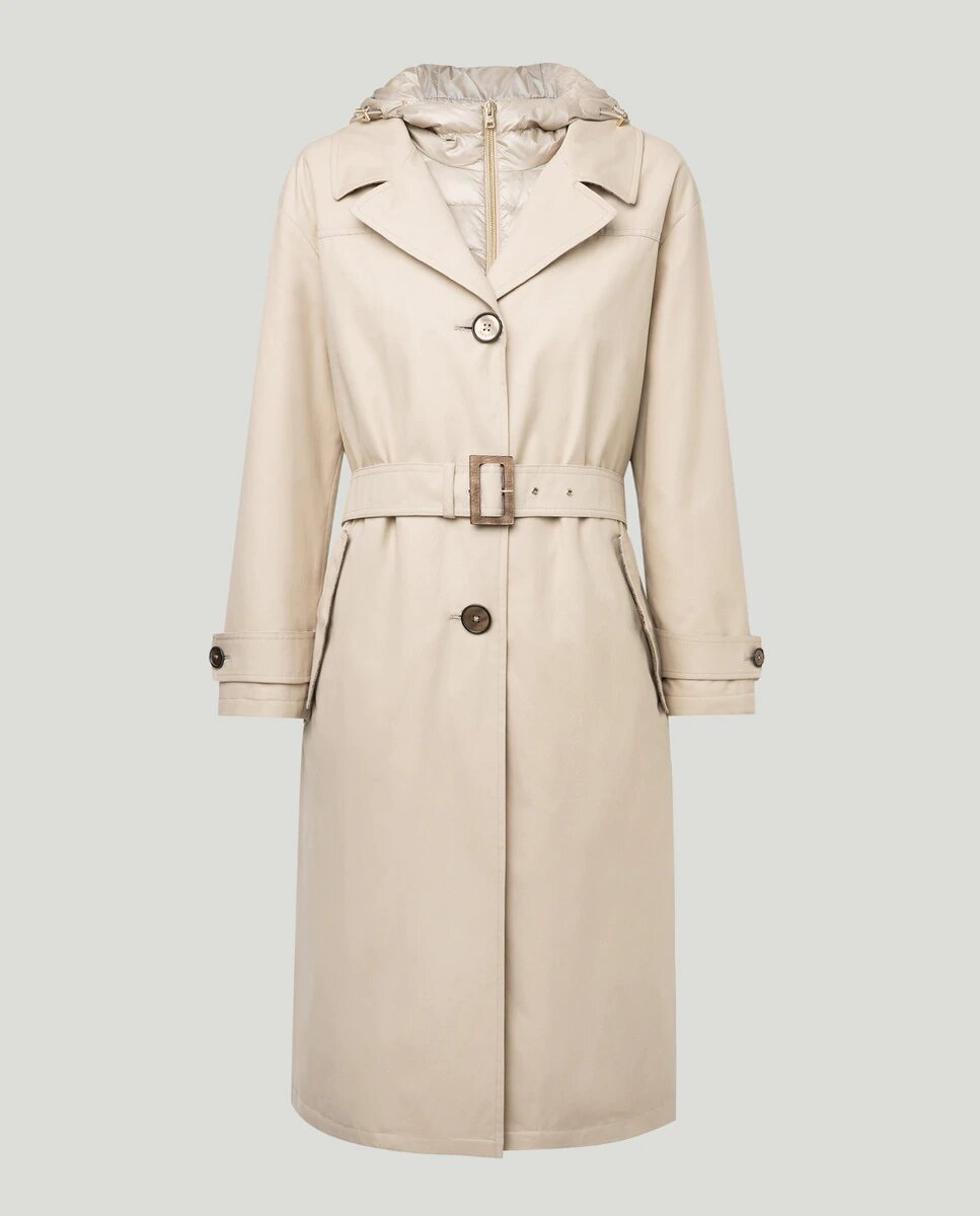 Ahora veremos esta gabardina impermeable de Herno de color hueso. Es una prenda 100% algodón, con babero desmontable ajustable, capucha y cremallera. Asimismo, cuenta con manga larga acabada en puño, cinturón, cierre de botones y relleno de guata.