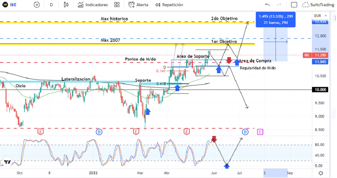 Es importante establecer algunas condiciones para la continuidad alcista de la acción de Iberdrola. Identificamos un área de soporte entre los 10,7 y 11,1 euros desde donde el precio puede tomar apoyo para el impulso alcista en busca del primer y segundo objetivo correspondiente a sus máximos históricos.