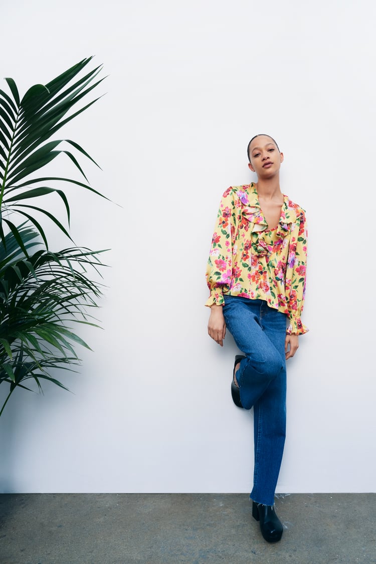 Acabamos el repaso a las mejores blusas de Zara con este original y refrescante modelo. colorido y con un alegre estampado de flores. El toque especial lo ponen los volantes que rodean la zona del escote.