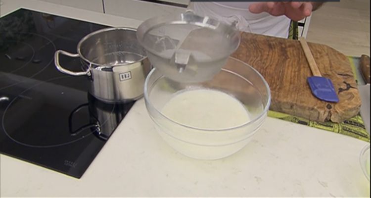 Comenzaremos infusionando la leche. Ponemos en un cazo la leche, la canela con la piel de limón y el azúcar. Cuando rompa a hervir retiramos y reservamos unos 20 minutos para que se infusione bien. Una vez que todo este popurrí de ingredientes ha hervido, lo dejaremos que atempere. Una vez que ha suavizado y está en más o menos templado, lo que haremos será colar la leche infusionada de lo que será nuestra leche merengada y lo metemos en el congelador como una hora mínimo (Arguiñano la deja casi 2). Debe de quedarse bien fría sin llega a estar congelada.