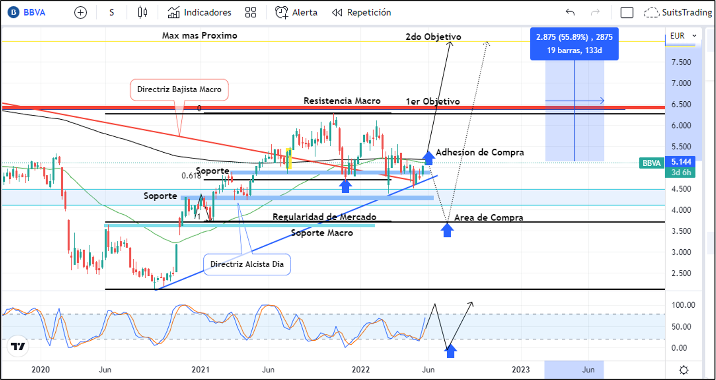Técnicamente mantenemos previsión alcista para las acciones de BBVA las cuales nos indican que desde el nivel actual ubicándose por encima de los soportes en inmediaciones de 4,8 euros y realizando la respectiva ruptura de las medias móviles exponenciales de 50 y 250 periodos de gráfico semanal, podrían generar el impacto necesario para buscar un primer objetivo en la resistencia macro arriba de 6,2 euros. Posteriormente ubicamos un segundo objetivo en el siguiente máximo más cercano registrado en agosto de 2017 arriba de 7,9 euros por acción lo que corresponde a más de un 55% de beneficio.