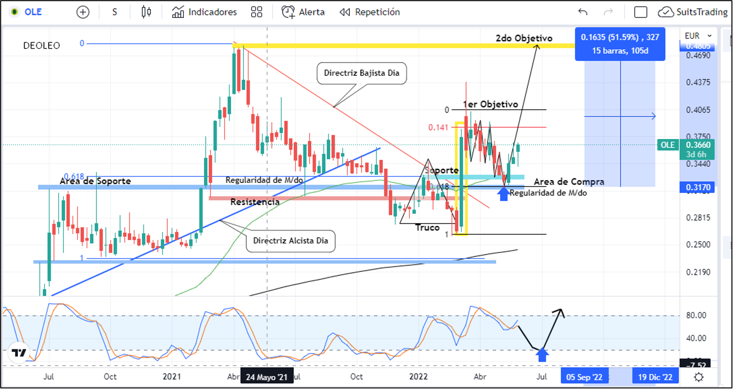Si comparamos la gráfica del artículo anterior con la presentada aquí, vemos la identificación gráfica que exponemos con oportunidad de compra en niveles de 0,3165 euros con un primer objetivo en el nivel sólido máximo más cercano, es decir, arriba de 0,40 euros y un segundo objetivo en el siguiente máximo que ubicamos de abril de 2021 en inmediaciones de 0,48 euros lo que representa más de un 50% de beneficio estimado a un mediano plazo.