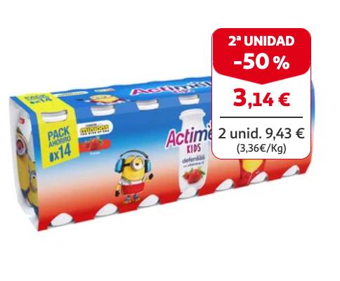 El pack de 14 botellitas está también dentro de la oferta de segunda unidad al %0%. La priemra unidad te cuesta 6,29 euros y la segunda es tuya por solo 3,14 euros. 28 botellitas por solo 9,43 euros.