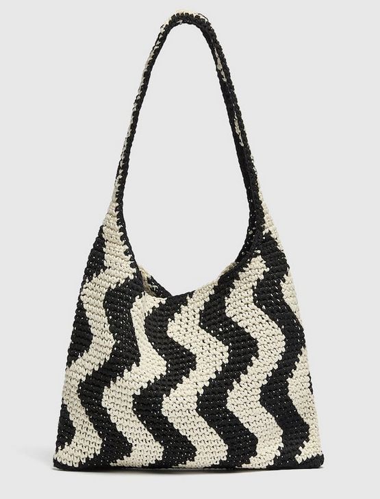 Muchas de las consumidoras de Pull&Bear que se acercan a cualquiera de sus tiendas no pueden evitar comprarse este bolso tan bonito que ves en la imagen. Y a nosotros no nos extraña, ya que es ideal. Destaca por tener un diseño de hombro y por tener un detalle de ondas en diferentes combinaciones de color. Tiene un asa corta de hombro y solo cuesta 19’99 euros.