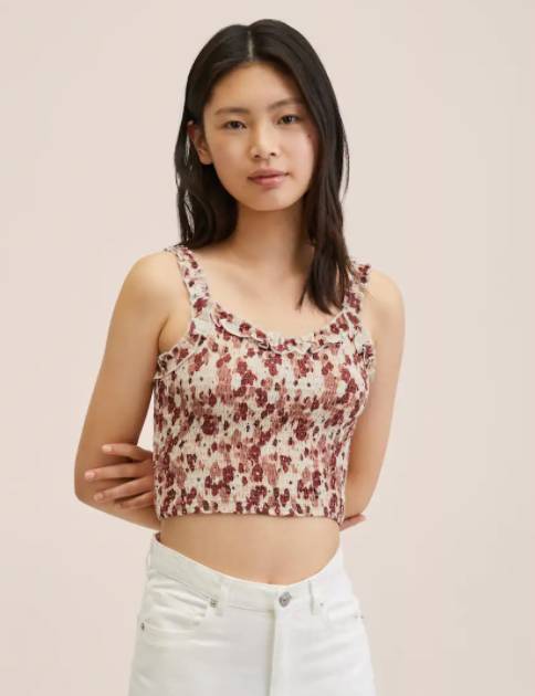 Volvemos a retomar el estampado floral, porque Mango ha hecho de él su seña de identidad para esta temporada. Ahora te mostramos una prenda de corte crop con un bonito color rosa palo en combinación con beige.