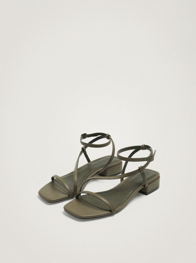 Este modelo es una sandalia plana con un poco de tacón y punta cuadrada En un bonito color caqui un poco metalizado y con detalle de tiras cruzadas que acaban en pulsera con hebilla en el tobillo.