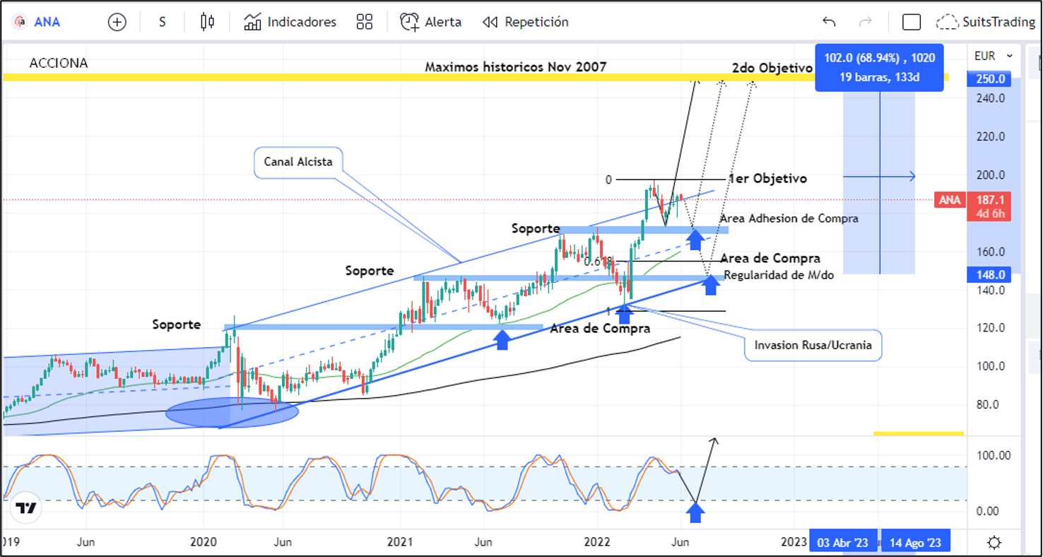 Este tipo de noticias impactan, obviamente, las acciones de Acciona Energía; sin embargo, como beneficio colateral, su alma mater, Acciona, presentó un impacto similar en trayectoria, aunque con menos revalorización. Sin embargo, hemos de notar que las acciones de esta compañía se mantienen trabajando en un canal ascendente, con claras y establecidas áreas de soporte que permiten vislumbrar objetivos pagaderos en el corto y mediano plazo.