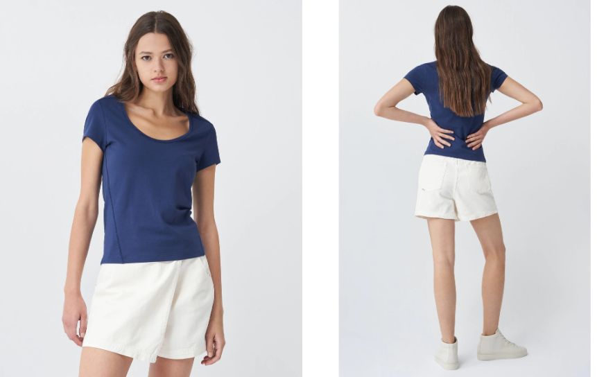 Seguimos con el color azul y con un modelo parecido pero con manga corta, perfecta para cualquier ocasión, sea para vestir casual o para llevar al campo o a la playa. También está con el 30% de descuento y es de la marca Salsa. Además, está fabricada en algodón orgánico, con corte ajustado en liso y escote redondo. Su precio ahora en El Corte Inglés es de 18,17 euros. La puedes adquirir en este enlace.