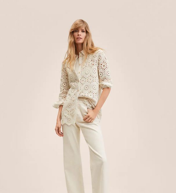 Nos encanta esta camisa que hemos visto en la tienda online de Mango. Y todo porque tiene un tejido mezcla de algodón y crochet. Además, también nos ha gustado mucho que tenga un diseño calado y un cuello camisero. Y, por supuesto, que sea tan económica. Si te decides a comprarla tan solo vas a tener que pagar por ella 59’99 euros.