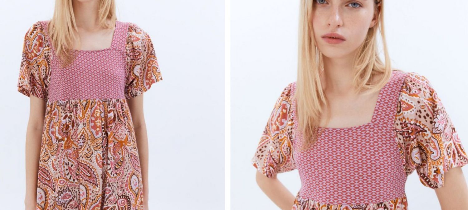 Toca otro vestido con eses aire hippie o ibicenco que nunca pasa de moda y siempre se demanda, al menos para que forme parte de una parte pequeña del armario, sobre todo si te vas de vacaciones o escapadas al campo. Es perfecto para ello, pero igualmente para reuniones sociales en las que es preferible ir cómoda porque espera una jornada o noche larga. Este es un modelo mezcla de estampados en manga corta y escote cuadrado, también hecho enteramente en algodón. Otra maravilla de Sfera por 15,99 euros y en tallas S a XL.