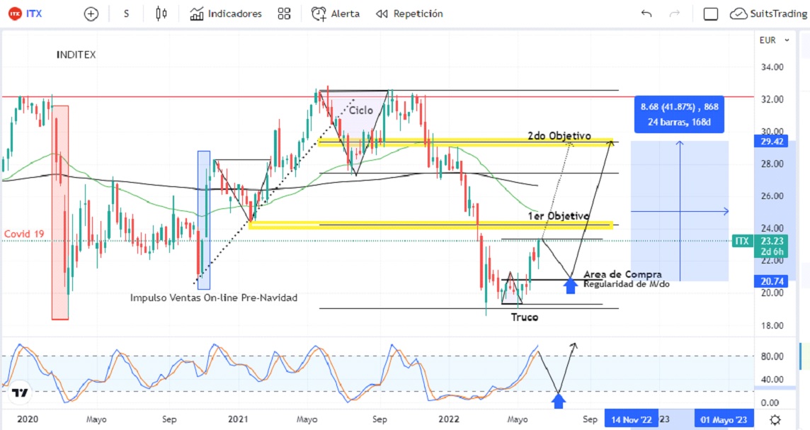 Técnicamente, las acciones de Inditex presentaron una abrupta caída desde noviembre del año pasado posterior al cierre de un ciclo que vislumbraba posibles retrocesos. Este movimiento fue mucho más profundo y se agravó con la llegada de la incursión de Rusia sobre Ucrania llevándolo a mínimos creados por la pandemia.