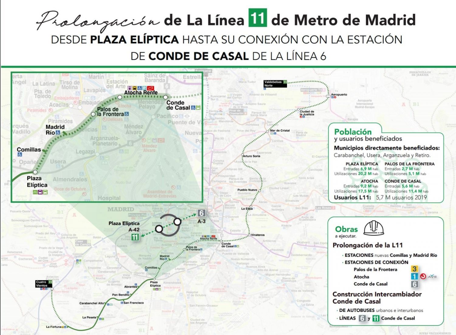 Según el trazado del proyecto, el túnel de la línea 11 enfila el paseo de Delicias a la altura de la estación de igual nombre, compartiendo trazado con la línea 3 hasta la altura de Palos de la Frontera. Los andenes de Palos de la Frontera de la línea 11 se situarán justo al norte de la curva al oeste que hace la línea 3.