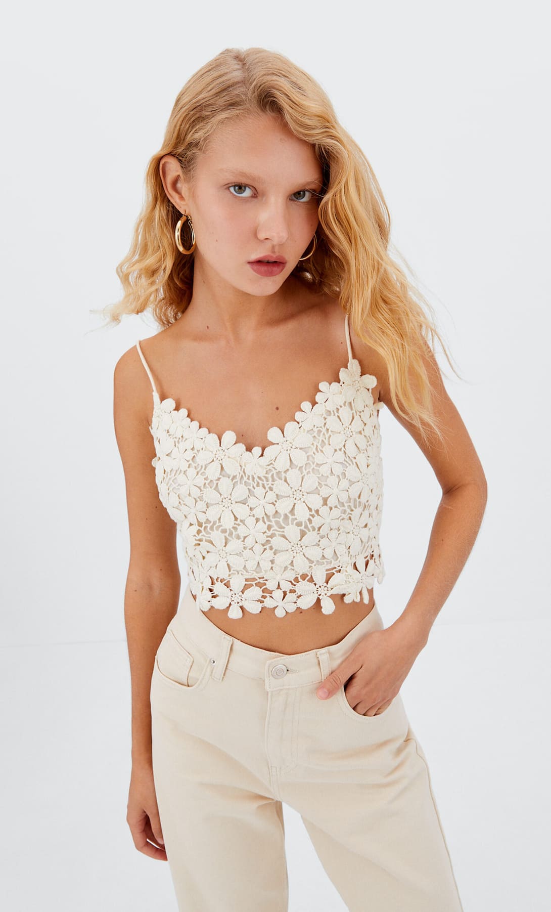 Sin lugar a dudas, estamos ante una de las prendas más originales de la temporada, porque el cuerpo de este top se compone de flores de diferentes tamaños cosidas a crochet, lo que crea un efecto único.
