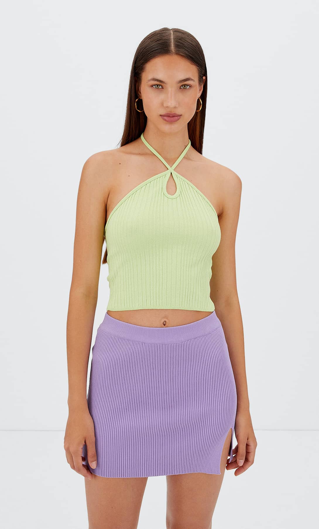 El escote halter es el escote por excelencia de esta temporada veraniega, en cualquiera de sus versiones. En esta ocasión está formado por dos tirantes finos que se entrecruzan a partir del escote de la camiseta.
