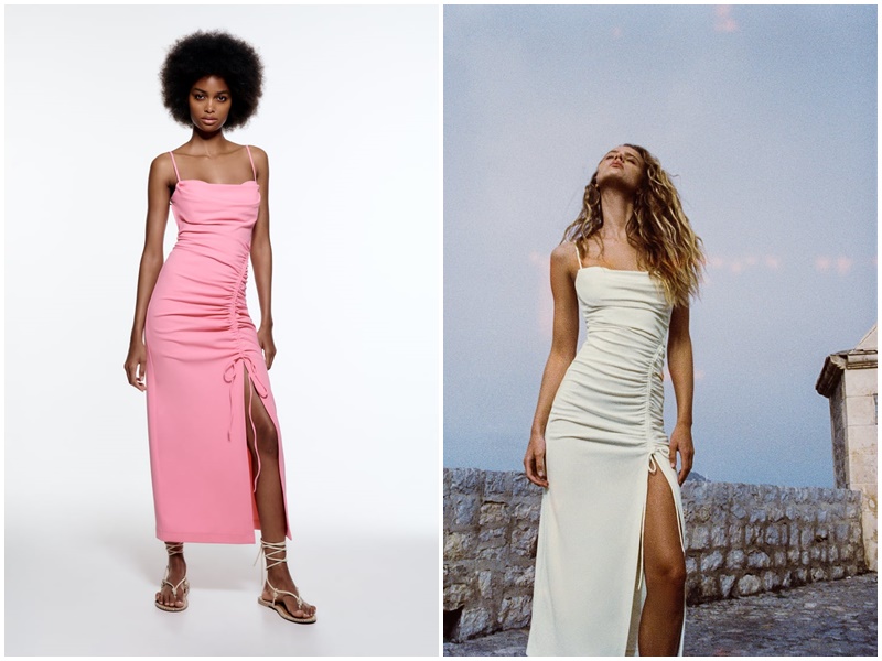 Seguimos con otro modelo que seleccionamos en esta lista, un vestido midi drapeado. Puedes encontrar disponibles en el catálogo de Zara en tres versiones: rosa, blanco o verde. Este es un vestido midi de escote corazón con tirantes finos ajustables. Tiene detalle tejido fluido en pecho y drapeado ajustable con cordones en bajo delantero. El forro interior combinado a tono y el cierre en espalda con cremallera oculta en costura. El material es 100% poliéster. Su precio es de 35,95 euros.