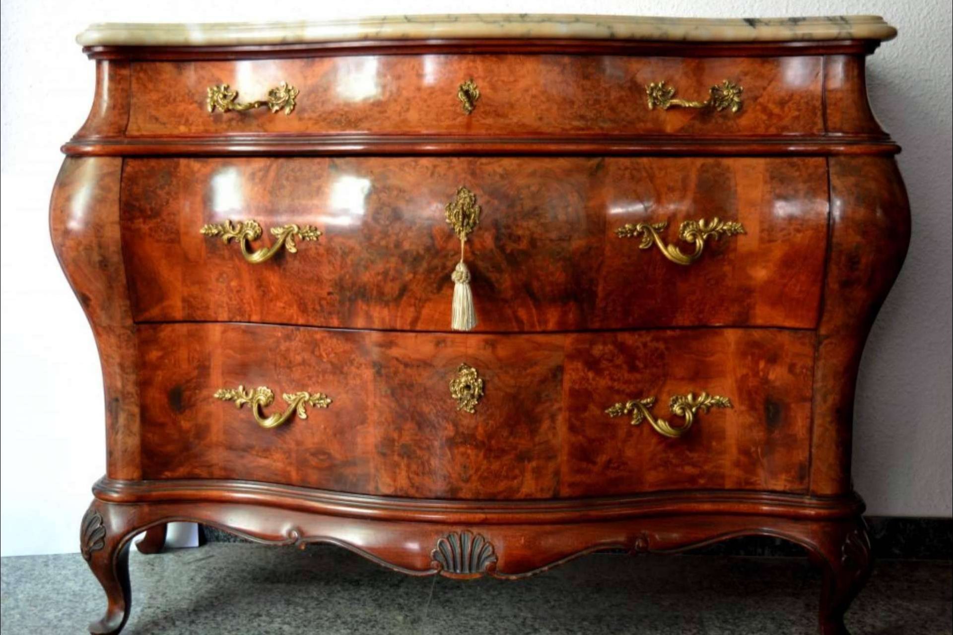 Los muebles antiguos presentan diseños y estilos diferentes. Se pueden encontrar mesas auxiliares, bargueños, vitrinas, cómodas, aparadores y escritorios. Los mobiliarios suelen estar elaborados con madera de nogal o de caoba. Algunas de estas piezas son talladas y otras tienen incrustaciones de marquetería. Asimismo, los herrajes o tiradores de los productos son, en su mayoría, de bronce.