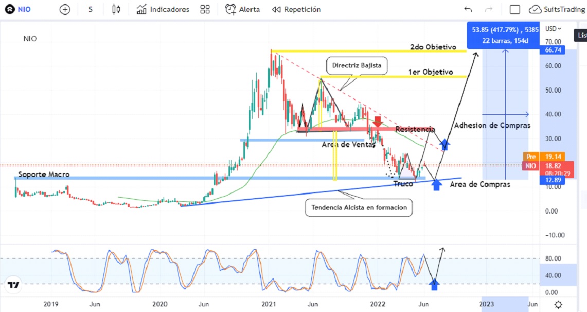 Desde los máximos históricos registrados en la semana del 11 de enero de 2021 cuando alcanzó los 66,99 dólares y hasta los precios actuales, las acciones de este fabricante de coches eléctricos se han desvalorizado cerca de un -72%. En lo corrido del año, las acciones han perdido cerca del -44% desarrollando y confirmando una directriz bajista que llevó sus acciones hasta los precios máximos en la semana de su debut en bolsa, lo cual representa de por sí su soporte más importante, hablamos de los 13,8 dólares.