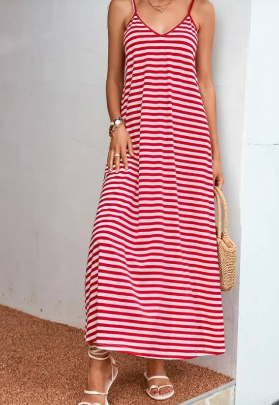 Un vestido largo de rayas en tonos rojos y blancos, rematado con un escote de pico bastante discreto y tirantes finos que puedes ajustar a tu gusto. Lo tienes disponible en otros colores.