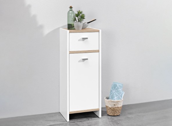 En Lidl podemos encontrar este armario de baño de diseño moderno en acabado mate con imitación de roble de alta calidad. Viene con protectores para no dañar el suelo. Al parecer no gustó a los clientes porque los armarios no están embalados correctamente, todo está despegado. Incluso dicen que los armarios son realmente difíciles de montar.