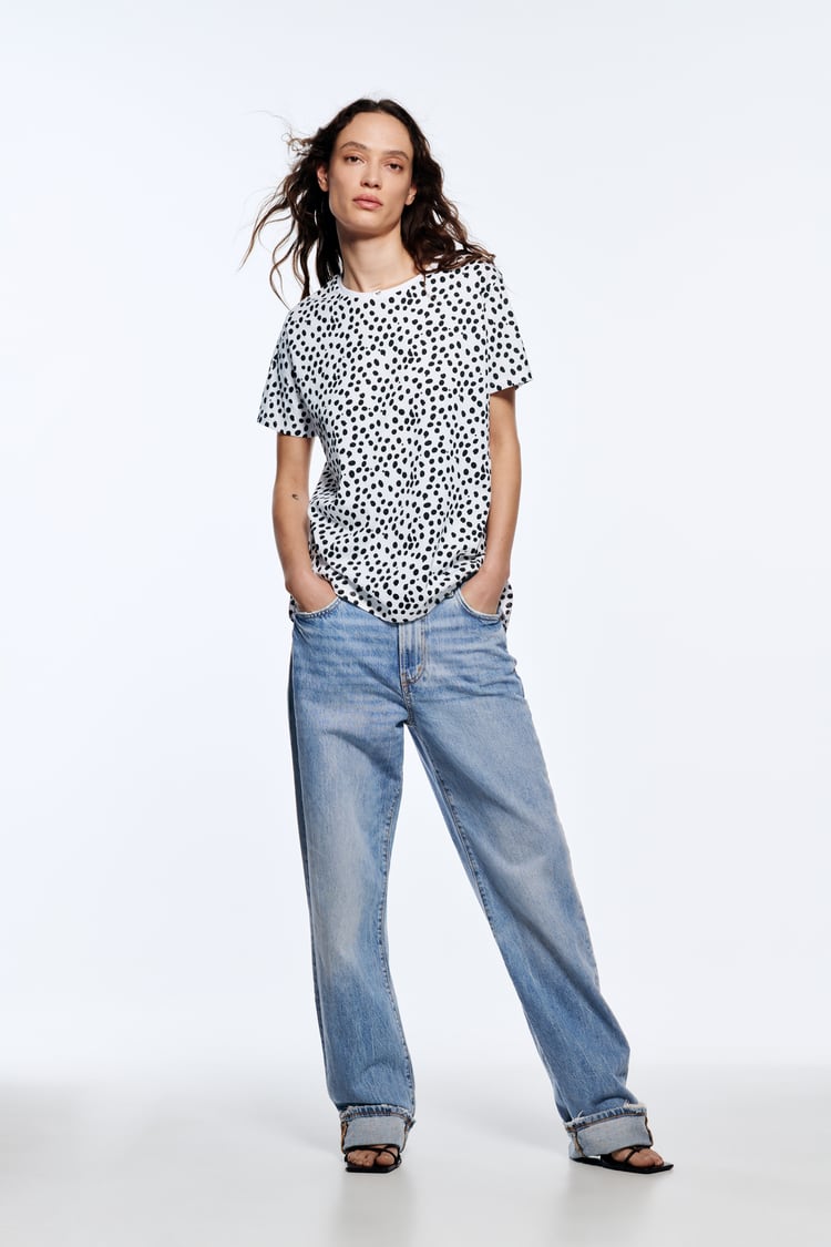 Es una camiseta de cuello redondo con manga corta y bajo asimétrico, pero lo que la hace especial es su estampado a base de lunares que nos recuerdan un poco al estilo print animal.