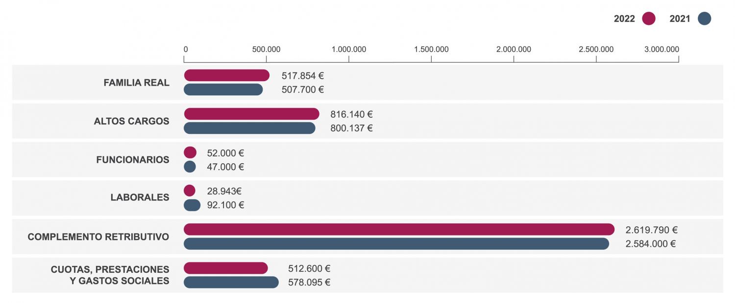 Los altos cargos reciben 816.140 euros. El que más cobra es el Jefe de la Casa Real, Jaime Alfonsín, que cobra 147.204 euros brutos, seguido de Domingo Martínez Palomo, secretario general, que cobra 145.789 euros brutos. Los funcionarios de carrera reciben 52.000 euros, mientras que el personal laboral recibe 28.943 euros.