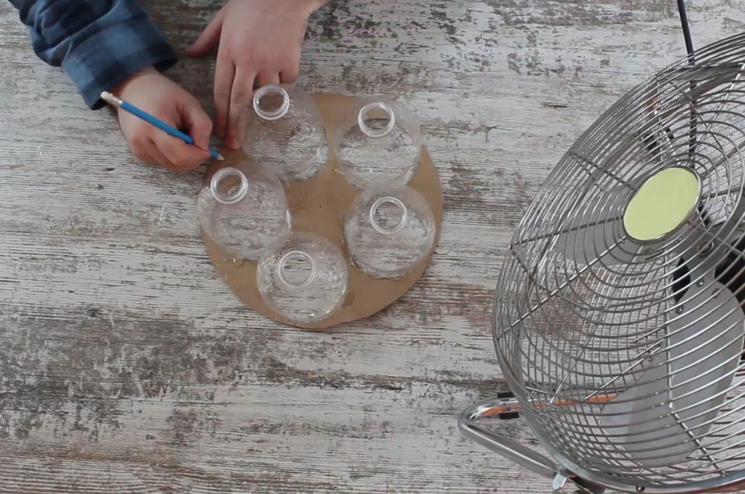 Solo se necesita tener botellas de plástico vacías, un panel ligero del tamaño de una ventana, tijeras y un taladro. Lo primero es hacer unos agujeros en el panel del tamaño de los tapones de las botellas. Después, hay que cortar las botellas a la mitad con las tijeras y colocar la parte superior en el tablero, con el cuello encajando en los agujeros que se hicieron. Luego, se pone el tablero en una ventana, con los cuellos de botella mirando hacia dentro de la casa, que se refresca de modo natural.