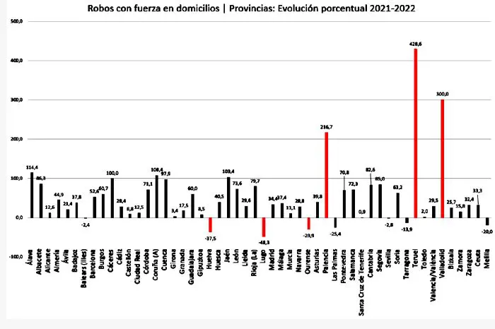 Siguiendo con los resultados en cifras absolutas, las provincias con mayor aumento de robos con fuerza en domicilios en cifras absolutas son: Barcelona (+1.139, pasando de 2.167 el primer trimestre de 2021 a 3.306 casos en el mismo plazo correspondiente a 2022), Madrid (+586, pasando de 1.703 a 2.289); y Valencia (+398, pasando de 1.348 a 1.746).