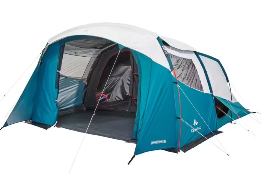 Después de ver todos los productos playeros de Decathlon, vamos a ver los de la montaña. Comenzamos con esta tienda de campaña familiar de Fresh&Black con capacidad para 5 campistas. Se trata de una tienda separada en varias partes, con dos habitaciones separadas para poder dormir de forma independiente. La gran tiene capacidad para 3 colchones de 70 cm, mientras que la pequeña tiene espacio para 2.