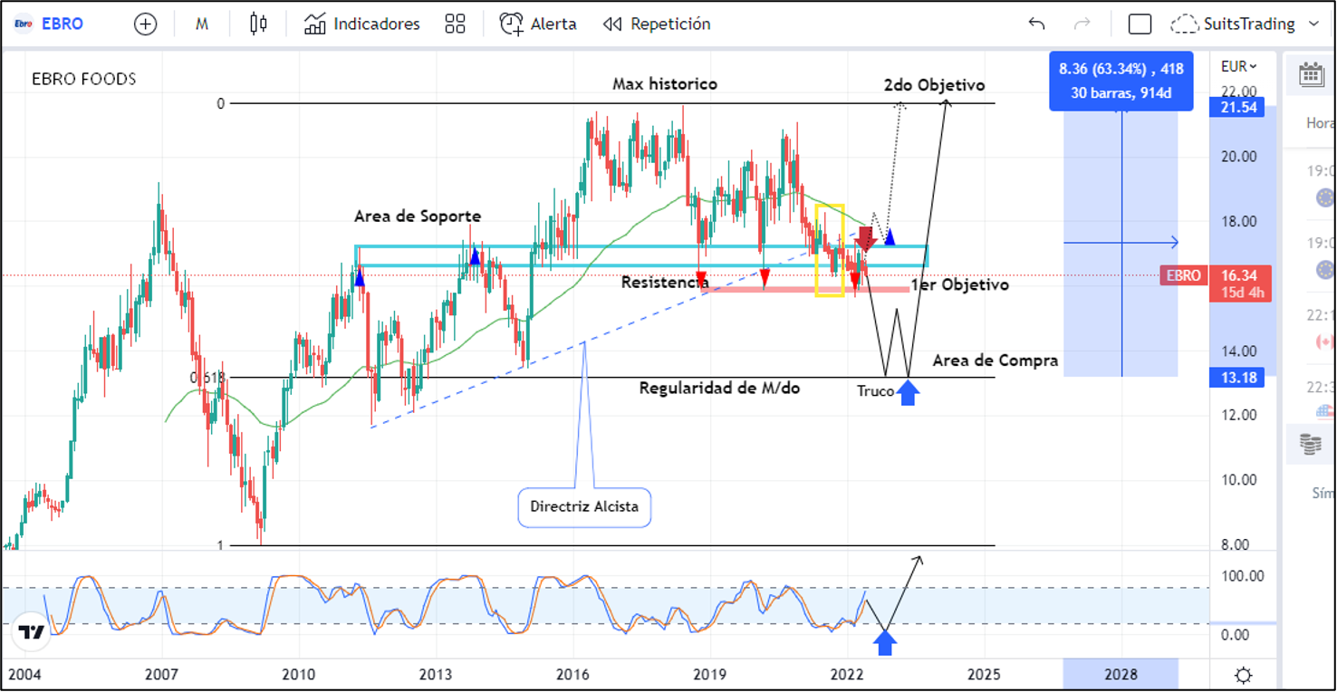 Este movimiento supone una desvalorización de la acción en un -20%; sin embargo, una vez el precio se regule a nivel de 13 euros, dará una confirmación de punto de giro a través de un truco para comprar buscando un primer objetivo en la resistencia que el precio ha dejado desde 2018 en inmediaciones de 15,8 euros que, de llevarse esas áreas con solidez, podrá buscar un segundo objetivo arriba de 21,5 euros que corresponden a los máximos históricos. Operación que nos dará como beneficio más de un 60% estimado al mediano y largo plazo.